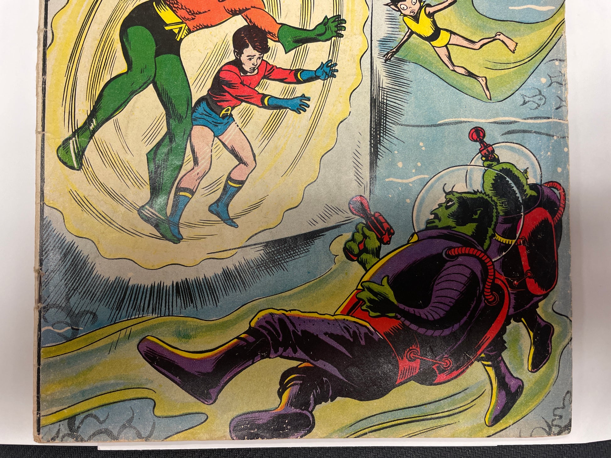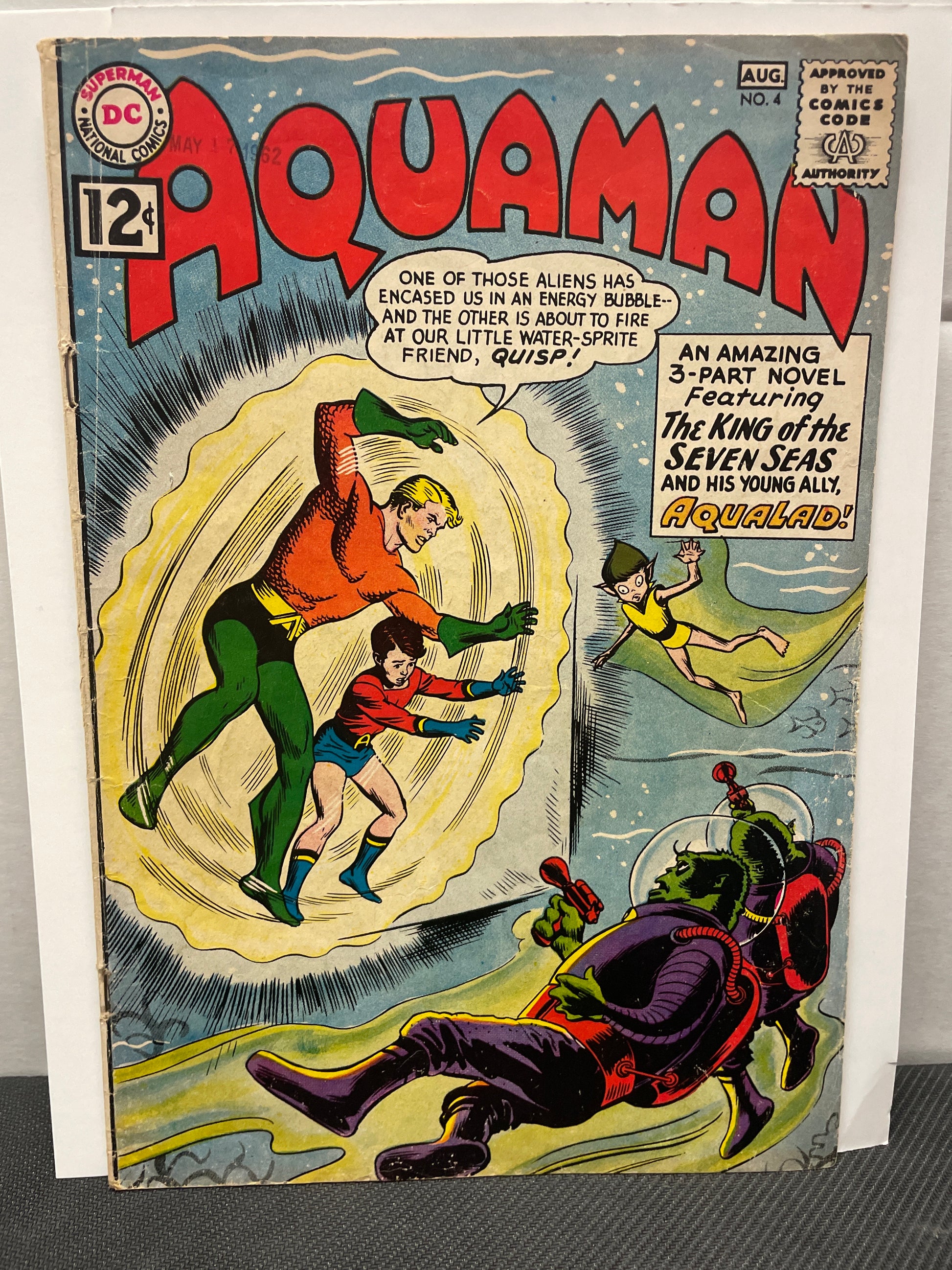 Here we present a very nice copy of DC’s silver age issue of Aquaman #4, published in 1962. This very early issue includes a beautiful Nick Cardy cover and the Aqualad!