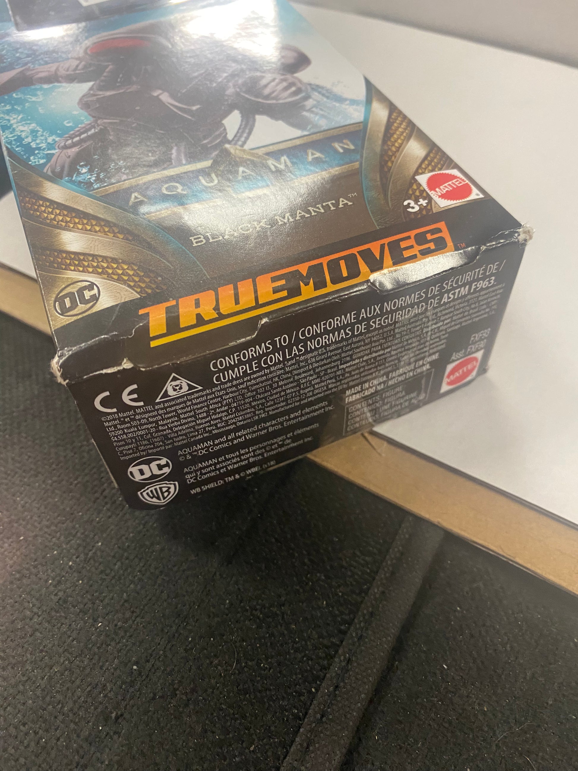 MATTEL AQUA-MAN BLACK MANTA ACTION FIGURE (2018) PLASTIC CUT ON FRONT OF BOX
